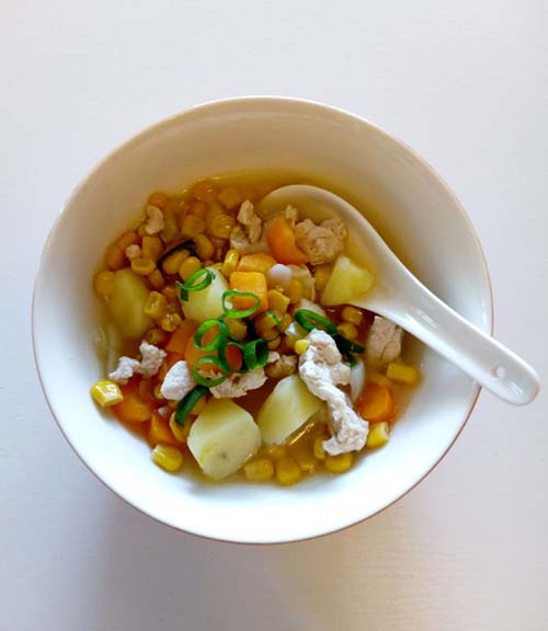 Kuori, huuhtaise ja paloittele perunat ja porkkanat. Pilko sipuli. Laita kattilaan kuumenemaan 2 rkl voita. Laita vettä valmiiksi kiehumaan. Kuullota ensin hetki sipulia ja lisää sitten kasvikset joukkoon. Sekoittele välillä, mutta anna osan ottaa ihan hieman väriä, tämä irrottaa paremmin makua keittoon. Lisää kiehuva vesi ja fondi. Anna porista kevyesti n. 15 min ja paista sillä välin kanasuikaleet ja kiehauta tarvittaessa lisää vettä. Lisää kana ja maissit keittoon. Valmista suuruste, itse käytin 4 rkl vehnäjauhoja. Lisää kylmää vettä varovasti ettei seoksesta tule liian vetistä. Kaada nauhana keiton sekaan samalla sekoittaen. Tarkasta, että perunat ovat kypsiä ja keitä miedolla lämmöllä jos perunat kaipaavat vielä pehmetä.