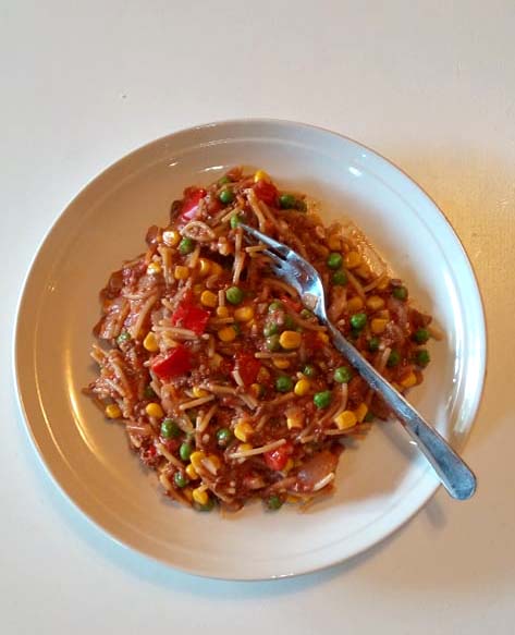 Valmista soijarouhe ohjeen mukaan ja anna hetki vetäytyä. Lisää halutessasi liemikuutio tai mausteita. Sillä välin hienonna sipuli ja valkosipuli. Kuullota sipulit pannulla voissa tai öljyssä ja lisää sen jälkeen soijarouhe. Pilko suippopaprika, laita joukkoon ja lisää joukkoon vesi. Tässä välissä voi laittaa myös spagetin jos haluaa, tällöin lisää reilusti vettä, eli varmaan se 5-6 dl, sekosin laskuissa koska vilkas 1 v roikkui kuin koalanpoikanen kintussa. Anna porista n. 4-5 min kunnes spagetti on lähes kypsää. Lisää tomaattimurska. Kuumenna ja lisää maissi sekä herneet. Lisää tomaattipyreetä maun mukaan. Anna hetki hautua. Mausta halutessasi suolalla ja pippurilla. Jos haluat notkistaa makua ja pehmentää tomaatin kirpeyttä, lorauta mukaan puoli desiä kermaa! Vielä maukkaampi? Kokeile pehmeäaromista juustoa esim. mozzarellaraastetta päällä.
