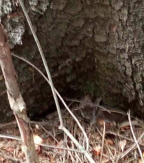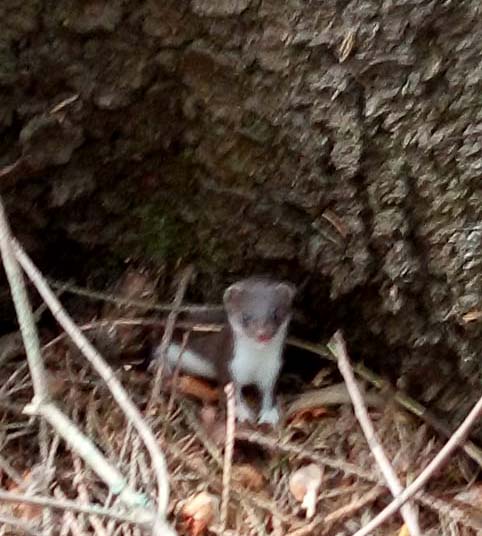 Lapset kurottuivat hitaasti lähemmäksi, mutta silloin meidät huomattiin. Miten nopeasti ne vilahtivatkin puun juurelle ja tuijottelivat hetken meitä kurotellen ja uteliaina. Kun jälleen liikahdimme, vips vaan, ne kaivautuivat juurakon myyränkoloihin. Yksi pikkuinen eksyi toisen kuusen juurelle ja vasta tuolloin äkkäsin kaivaa kameran esiin. Me emme vaikuttaneet pelottavan juurikaan sitä, mutta kännykästä se ei pitänyt. Pikku lumikko vikisi ensin hennosti ja kun yritin zoomata, se kaivautui yhdellä pikku hännänheilautuksella piiloon.