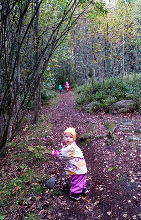 Yleensä kerran viikossa tai kahdessa teemme lasten kanssa metsäretken. Lapset rakastavat näitä päiviä! Opettelemme tunnistamaan kasveja, sieniä, puita ja eläimiä. Eläimistä bongailemme useimmiten variksia, harakoita, naakkoja ja pikkulintuja. Oravan huomaaminen on jo onnenpotku kaupungin lähimetsässä.