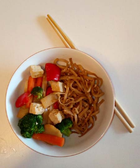 Leikkaa renkaiksi tai hienonna sipuli. Suikaloi porkkana pitkiksi suikaleiksi, pilko paprika ja leikkaa irti parsakaalin kukinnot. Laita paistokasari tai wokkipannu kuumenemaan. Lisää kuumalle pannulle voi ja kuullota hetki sipulia. Lisää tofu. Paista keskilämmöllä tofulle paistopintaa ja siirrä sitten tofu ja kuullotettu sipuli hetkeksi syrjään. Lisää pannulle hieman seesamöljyä ja kasvikset. Kaada noin puolet kastikkeesta sekaan. Paista 10-15 min, kunnes kasvikset ovat hieman pehmenneet. Kasviksiin saa jäädä purutuntumaa. Paistoajan loppupuolella kannattaa jo alkaa valmistaa nuudelia.