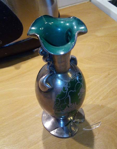 Suurennettuna näkyy maljakkoa joskus korjattaneen. Tämä ei erottunut kuin vasta kuvasta. Maljakko on pieni, ei edes kämmenen mittainen. Ja aivan metallisen näköinen!