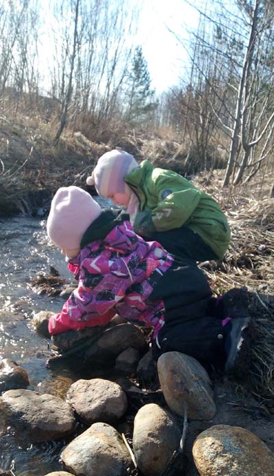 Onko lähellä puro tai oja? Kaarnaveneet pitävät suosionsa. Lähettäkää niitä matkaan ja ottakaa kisa kenen kaarnalaiva etenee nopeimmin tai kenen uppoaa ensiksi? Virtaavassa vedessä on jotain kiehtovaa ja pelkkä ojan tai puron tutkiminen riittää. Mikä ettei rakentaisi pieniä ”patojakin”.