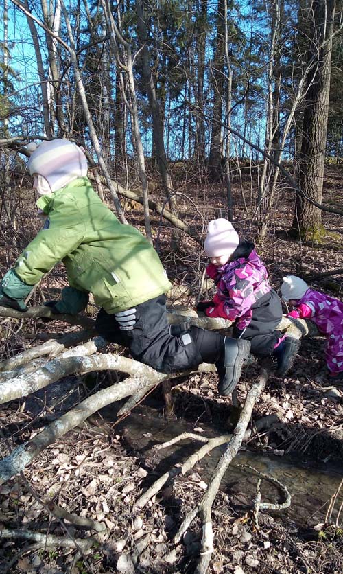 Tehkää pieniä pesiä tai mörkömajoja puiden juurille oksista, havuista ja kivistä. Mille eläimille tai olennoille ne teette? Mitä ne tarvitsevat sinne sisälle ja syövätkö ne kuusen- tai männynkäpyjä? Mielikuvitusleikissä viihdytään pitkään ja tämä on meillä supersuosittua.