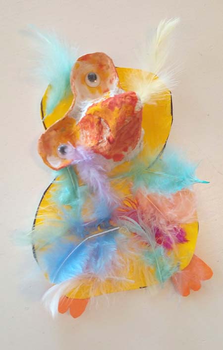 (Pääsiäis)tiput. Tarvitset: sakset, munakennon, sormivärit, irtosilmiä, mustan tussin, keltaista kartonkia, höyheniä, serviettejä tai silkkipaperia sekä oranssia paperia tai kartonkia.