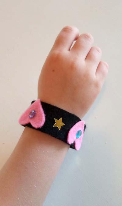 Mittaa sopivan pituinen pätkä askarteluhuopaa ja leikkaa se irti. Ommelkaa tai liimatkaa ensin tarranauha reunoihin. Muista laittaa tarranauhat vastakkaisille puolille! Suosittelen vahvasti ompelemista muutamin pistoin, sillä vaikka liima on helpompi tulevalle eskarilaiselle, kaulakorun käyttöikä jäi liiman heikentyessä harmillisen lyhyeksi. Leikatkaa pinkistä huovasta sopivan kokoiset sydämet ja kiinnittäkää ompelein tai liimalla helmet keskelle. Ommelkaa tai liimatkaa koristeet rannekoruun. Valmis!