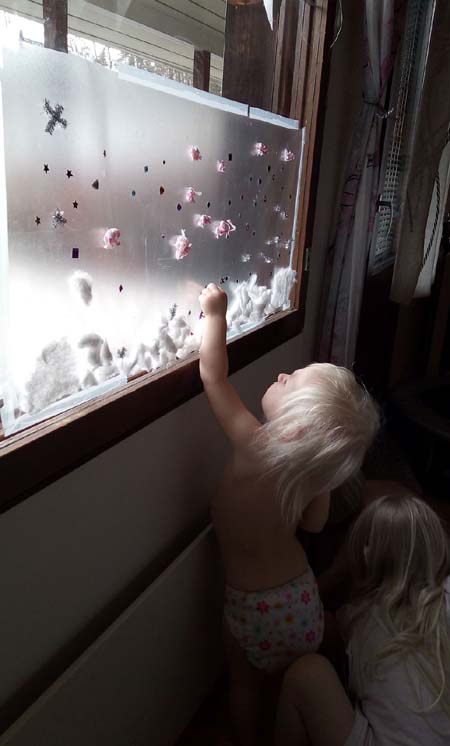 Ikkunataide. Tarvitset kontaktimuovia, sakset, teippiä ja kaikkea hauskaa kiinnitettävää. Kokeilkaa värikkäitä silkkipapereita, papereita tai serviettejä, kimalteita, strasseja, piippurassia, nappeja, pumpulia, foliota… Mitä vain keksitte!